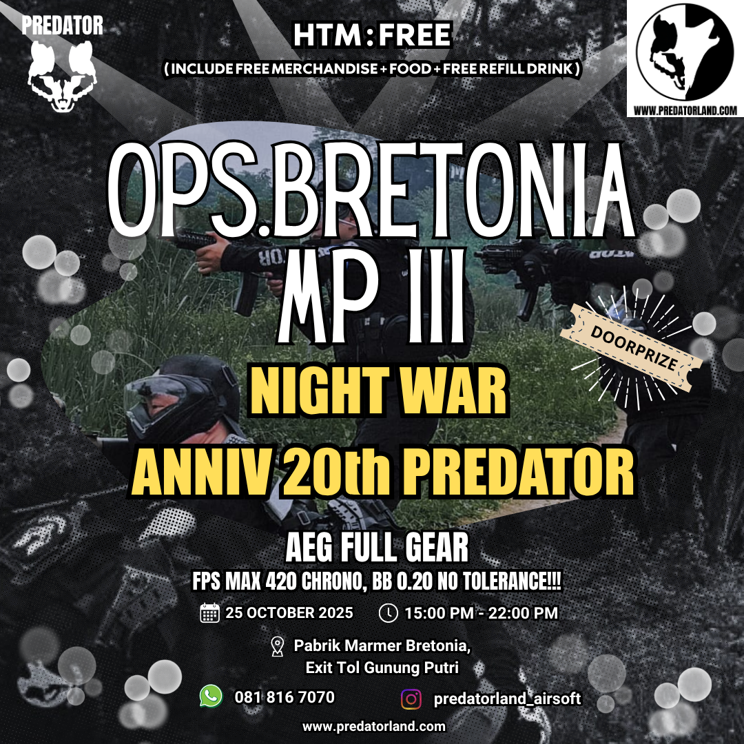 Predatorland adalah Arena Permainan Airsoftgun, Water Gell, dan Nerf Indoor terbesar di Indonesia. Dengan luasan lebih dari 2500m2, kami mempunyai beberapa macam arena seperti; Arena Wargame, Arena 3on3, AAIPSC, & Shooting Range.